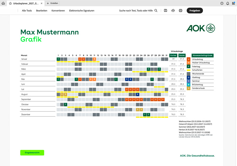 - Anleitung: Alle Schritte zur bestmöglichen Nutzung des Urlaubsplaners sowie praktische Tipps finden Sie auf der ersten Seite im PDF.