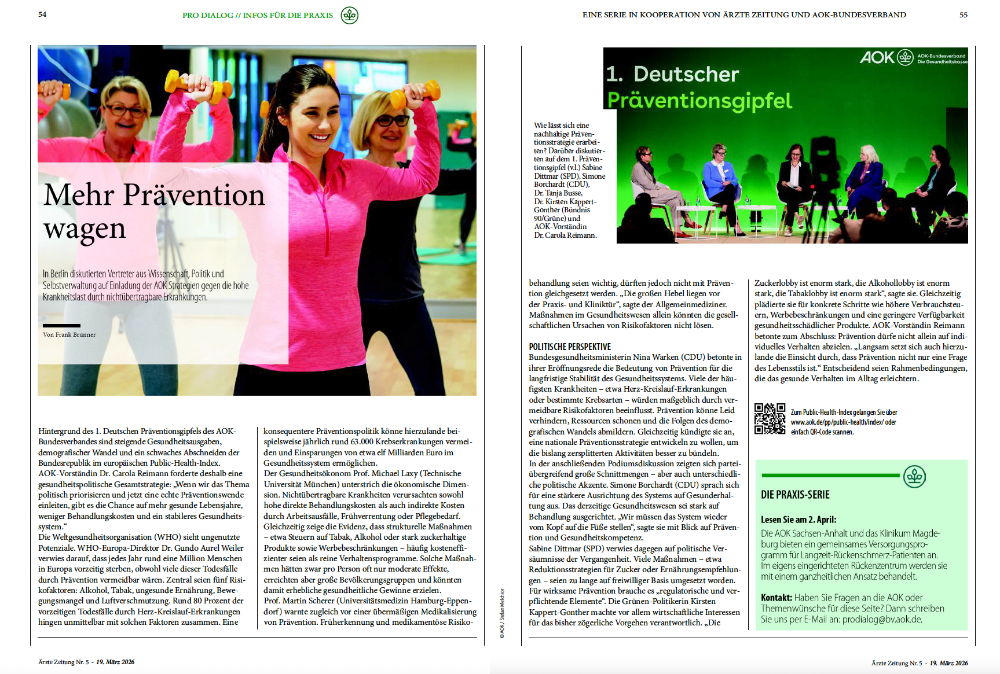 AOK-Vorständin Dr. Carola Reimann forderte deshalb eine gesundheitspolitische Gesamtstrategie: „Wenn wir das Thema politisch priorisieren und jetzt eine echte Präventionswende einleiten, gibt es die Chance auf mehr gesunde Lebensjahre, weniger Behandlungskosten und ein stabileres Gesundheitssystem.“