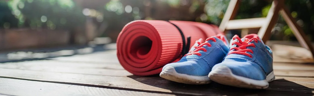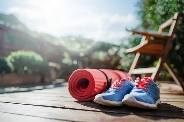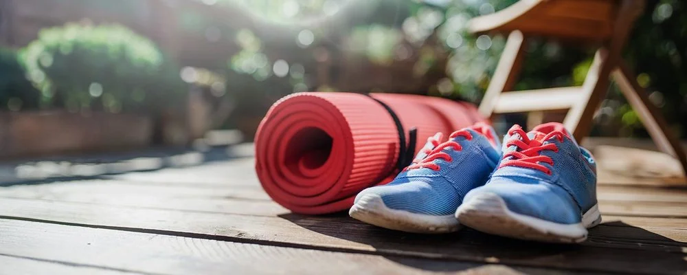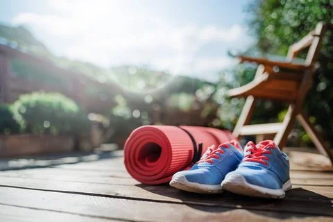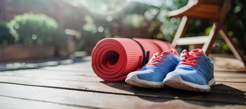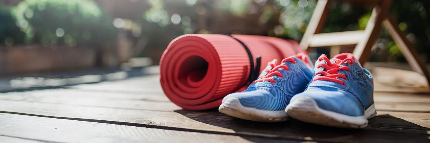 Rote Yogamatte und blaue Sportschuhe mit roten Schnürsenkeln auf Holzterrasse vor Gartenstuhl im Freien.© iStock / Halfpoint