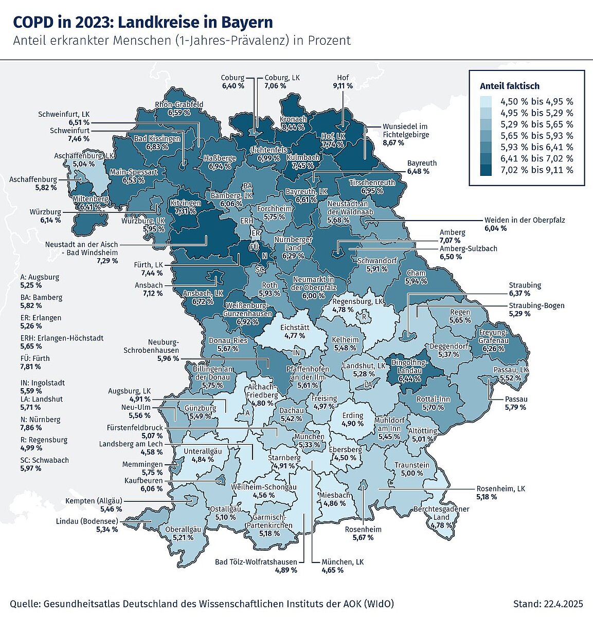 Die regionalen Unterschiede bei der Krankheitshäufigkeit, die der Gesundheitsatlas Deutschland für Bayern bis auf die Ebene der 96 einzelnen Kreise und kreisfreien Städte darstellt, sind groß: In den oberbayerischen Landkreisen Ebersberg und Weilheim-Schongau etwa leben mit 4,50 bzw. 4,56 Prozent die wenigsten Patientinnen und Patienten mit einer COPD. Am stärksten betroffen sind zwei Städte in Oberfranken: Hof mit 9,11 Prozent und Wunsiedel mit 8,67 Prozent.
