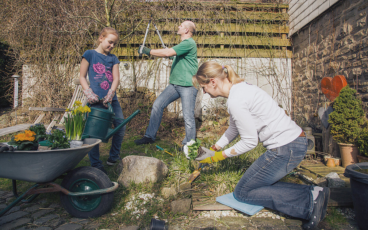 Nützlich sind dabei rückenschonende Hilfsmittel wie verstellbare Stiele für Rechen und Spaten, ein Hochbeet oder auch ein schonendes Kniekissen. Um den Rücken nicht zu sehr zu belasten, sollte man beim Unkrautjäten nicht gebeugt stehen, sondern in oder auf die Knie gehen. Beim Heben oder Graben empfiehlt Ebel, die Beine immer leicht anzuwinkeln: "Arbeiten Sie immer mehr aus den Beinen heraus und weniger aus dem Rücken." Schwere Lasten wie Erde oder Kübelpflanzen lassen sich am besten mit der Schubkarre oder einem Rollbrett bewegen. Beim Tragen, zum Beispiel von vollen Gießkannen, sollte man auf eine gleichmäßige Verteilung des Gewichts achten.