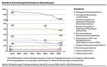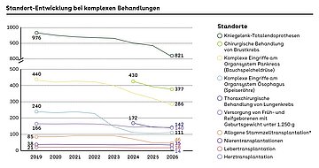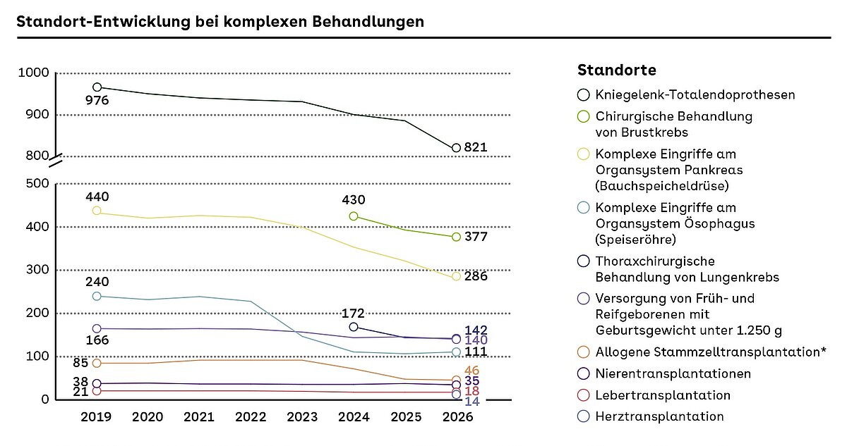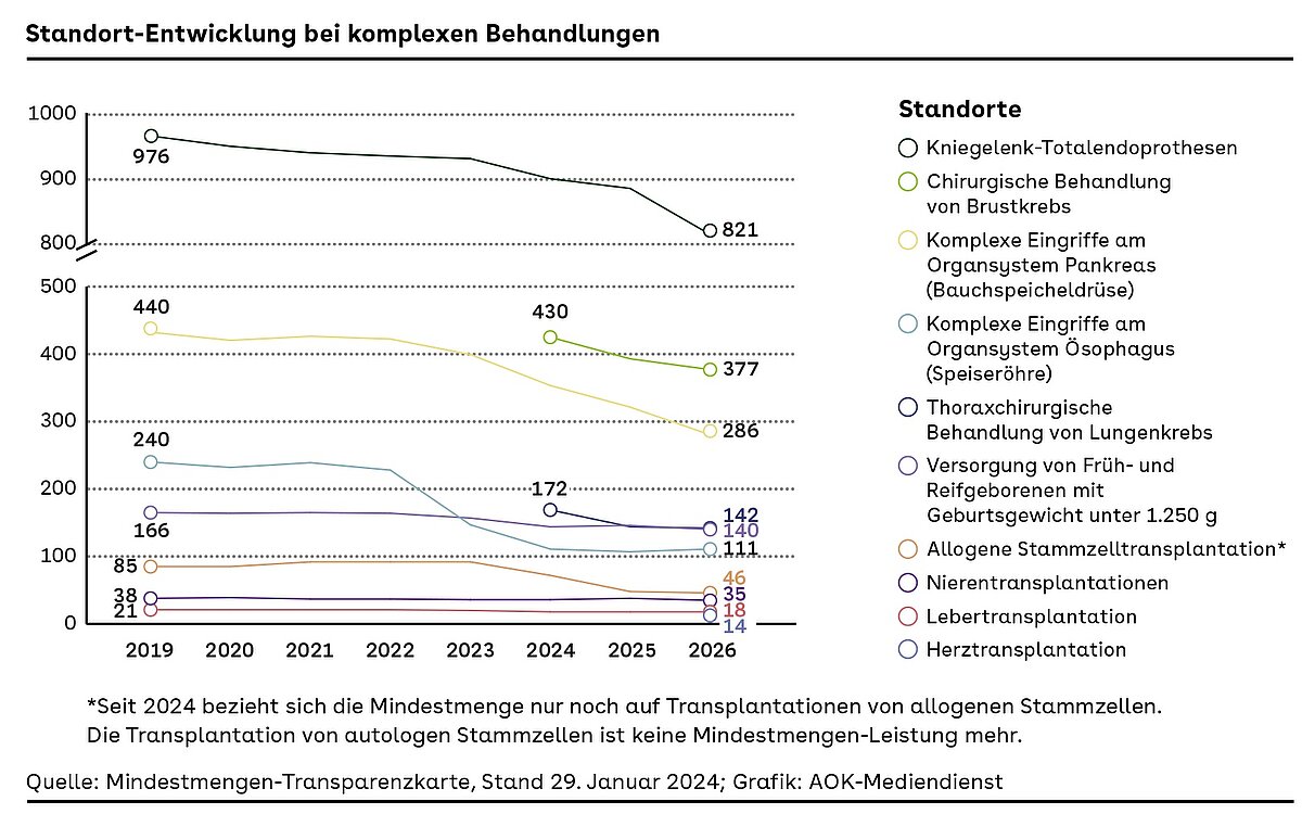 Darunter fallen Behandlungen und Operationen bei verschiedenen Krebserkrankungen, Nieren-, Leber und allogene Stammzellentransplantationen, die Versorgung von Frühgeborenen mit besonders geringem Geburtsgewicht sowie die Implantation von Kniegelenk-Totalendoprothesen. 2026 neu hinzugekommen sind Herztransplantationen: 14 Standorte sind künftig berechtigt einen solchen Eingriff durchzuführen, weil sie die notwendigen Mindestmengen-Vorgaben des Gemeinsamen Bundesauschusses (GBA) erfüllen.