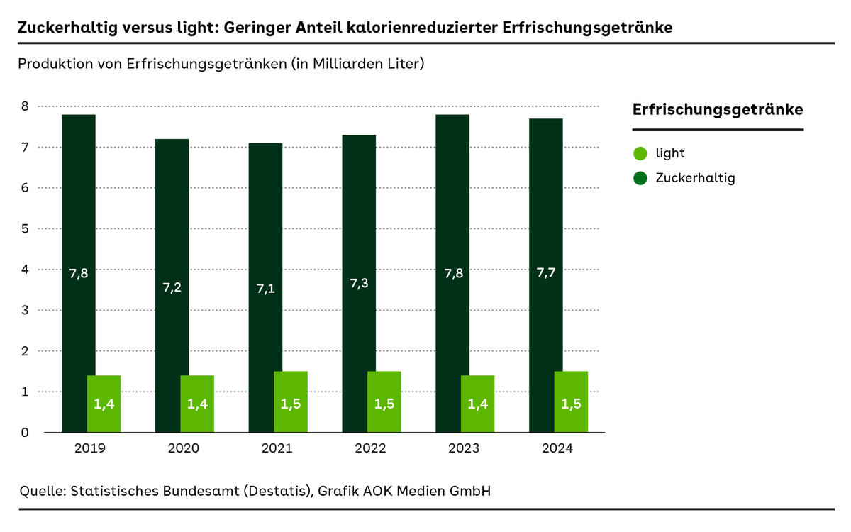 Laut Destatis ist die Produktion zuckerhaltiger Erfrischungsgetränke zwischen 2019 und 2024 nur leichten Schwankungen unterworfen. 2019 lag die Produktion mit 7,8 Milliarden Litern nur unwesentlich höher als die 7,7 Milliarden Liter des Jahres 2024. Zwischenzeitlich sank die Produktion zwar ein wenig, unterschritt aber zu keinem Zeitpunkt die Marke von 7,1 Milliarden Litern (2021). Im Vergleich dazu machte die Menge zuckerreduzierter Getränke nur einen Bruchteil aus. Sie blieb im benannten Zeitraum mit 1,4 Milliarden beziehungsweise 1,5 Milliarden Litern kalorienreduzierter Getränke nahezu konstant.