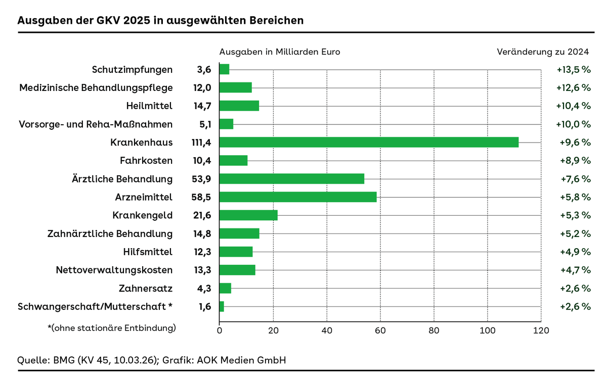 Maßgeblicher Treiber der hohen Ausgabendynamik blieben auch 2025 die Krankenhaus Krankenhäuser sind Einrichtungen der stationären Versorgung, deren Kern die Akut- beziehungsweise… -Behandlungen. 111,4 Milliarden Euro und damit noch einmal 9,7 Milliarden Euro (plus 9,6 Prozent) mehr als 2024 musste die GKV an die Kliniken in Deutschland überweisen. Seinerzeit hatten die Krankenhauskosten der Kassen erstmals die 100-Milliarden-Euro-Marke übertroffen. Gründe dafür seien „vor allem hohe Vergütungssteigerungen sowie die Refinanzierung bisher nicht abgebildeter Tarifkostensteigerungen aus dem Jahr 2024“, heißt es aus dem BMG.
