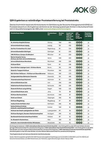 Die Kliniken, die im QSR-Verfahren überdurchschnittlich abschneiden und besonders geringe Komplikationsraten aufweisen, werden im Gesundheitsnavigator der AOK mit drei „AOK-Lebensbäumen“ gekennzeichnet, Kliniken mit durchschnittlichen Ergebnissen erhalten zwei Lebensbäume und unterdurchschnittlich abschneidende Krankenhäuser nur einen Baum. Statistisch betrachtet könnten pro 1.000 Patienten 105 Komplikationen vermieden werden, wenn die OP in einer Klinik mit überdurchschnittlicher Qualität ist ein zentrales Versorgungsziel der gesetzlichen Krankenversicherung (GKV). Im Rahmen der… stattgefunden hätte. Die Auswertung zu Prostatakrebs-Operationen hat gewisse Einschränkungen: So werden ausschließlich Komplikationen der Operation bis zu einem Jahr abgebildet. Die Qualität der Harnblasenentleerung nach der Operation sowie eine mögliche Inkontinenz oder Impotenz kann das WIdO mangels verlässlicher Daten nicht auswerten. „Trotzdem sind diese exklusiven Qualitätsinformationen eine wertvolle Orientierungshilfe für Patienten, die vor einer planbaren OP stehen“, betont Carola Reimann. „Sie gehen über die Qualitätsinformationen hinaus, die im Bundes-Klinik-Atlas angeboten werden. Gerade bei Krebs-OPs lohnt es sich für die Patienten, auch längere Fahrtzeiten in Kauf zu nehmen, um eine optimale Behandlung zu erhalten.“