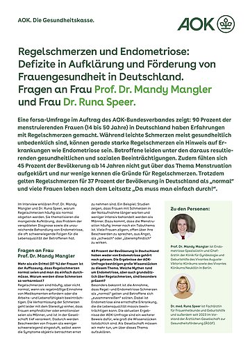 Um Betroffenen mit Menstruationsschmerzen zu helfen, hat die AOK eine bundesweite Kampagne unter dem Motto „Starke Regelschmerzen sind nicht normal“ ins Leben gerufen. Auf der AOK-Webseite stehen zahlreiche medizinische Informationen und Experten-Tipps zur Verfügung. Das Angebot richtet sich besonders an Frauen von 14 bis 29 Jahren. Darüber hinaus bietet die Gesundheitskasse auch Online-Live-Vorträge mit einer Psychologin zum besseren Umgang mit psychischen und physischen Menstruationsbeschwerden an. Interessierte können sich online anmelden. Das Angebot gilt auch für Nicht-AOK-Versicherte.