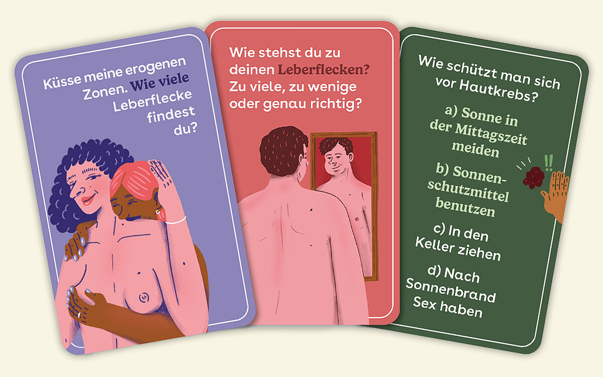 „Skintimacy – Das verführerische Spiel mit der Haut“ ist ein speziell für Paare in intimen Beziehungen entwickeltes Kartenspiel und steht kostenlos auf den Kampagnen-Webseiten zum Download zur Verfügung. Ab dem 26. August wird allen AMORELIE-Bestellungen eine analoge Version des Spiels zusammen mit einem Infoflyer zu Hautkrebsrisiken und -schutz beigelegt. Das Spiel umfasst 30 Karten: Aktionskarten verbinden den Haut- und Leberfleck-Check mit sinnlichen Berührungen, Fragekarten fördern offene Gespräche und helfen Tabus abzubauen, während Wissenskarten wertvolle Informationen über Präventions- und Vorsorgemaßnahmen vermitteln.