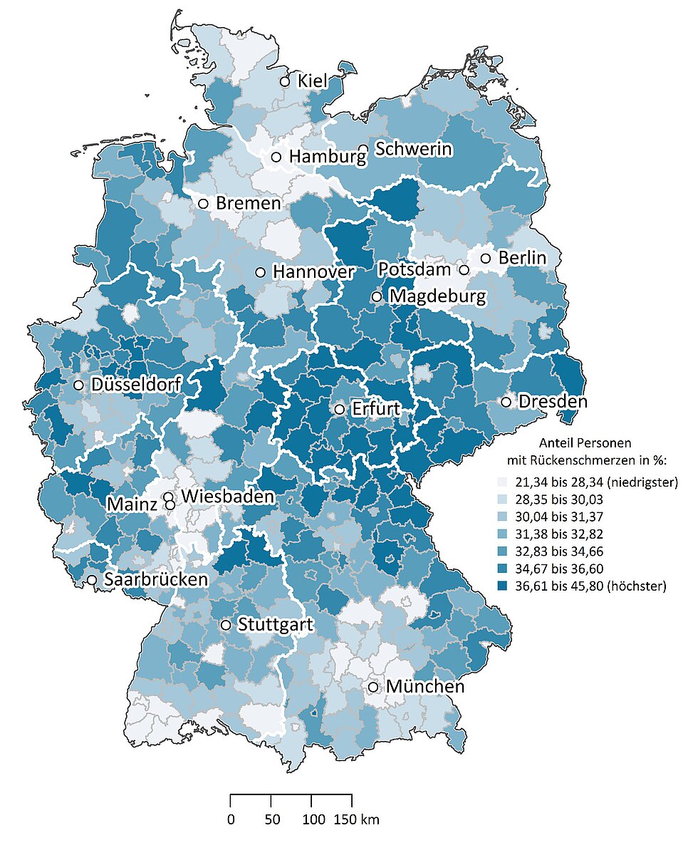 Im Gesundheitsatlas werden Zahlen zur Häufigkeit von ärztlich dokumentierten Rückenschmerzen dargestellt. Diese basieren auf Krankenkassenroutinedaten, in denen nur Patientinnen oder Patienten mit Rückenbeschwerden erfasst sind, wenn sie ärztliche Hilfe in Anspruch genommen haben. Darüber hinaus erfolgte jedoch keine Einschränkung nach Lokalisation, Intensität oder Dauer der Beschwerden.