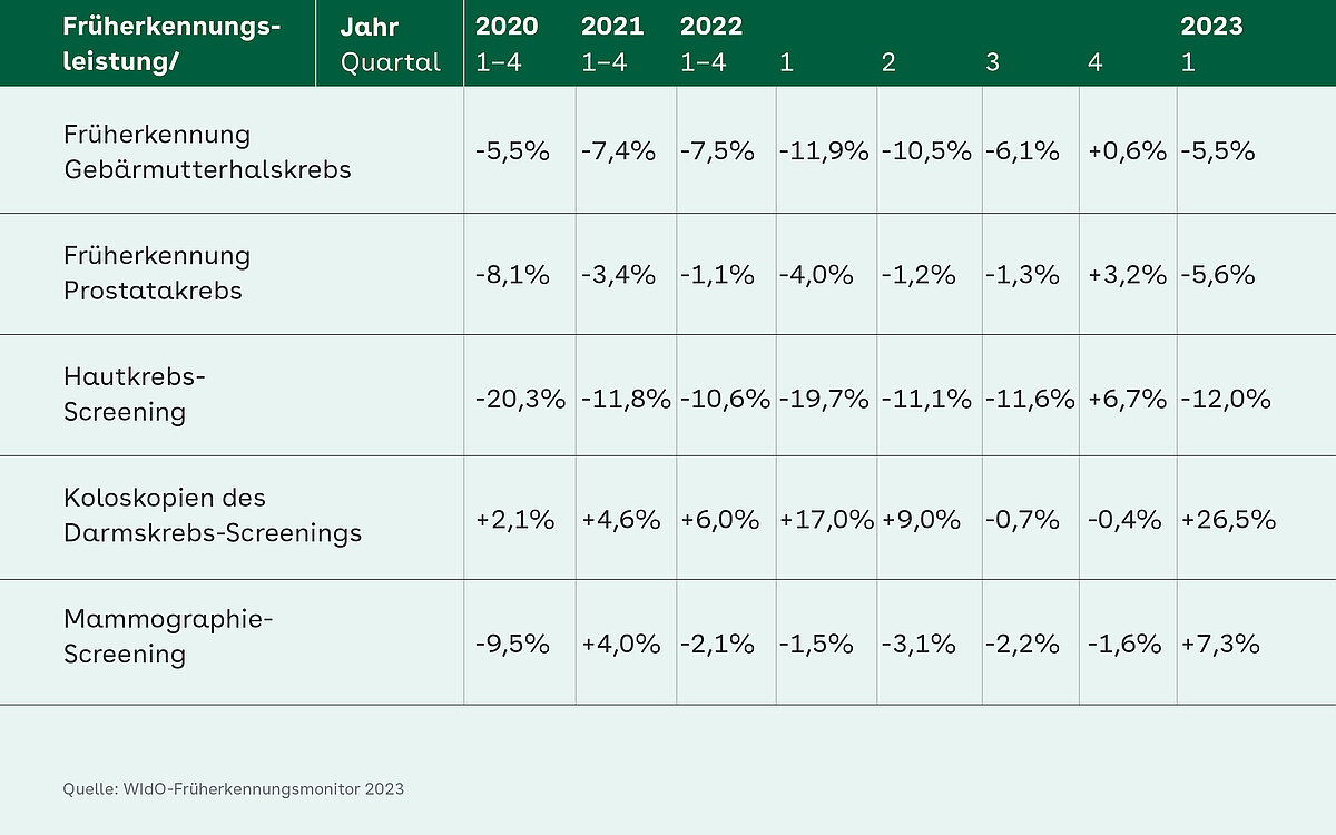 Die Detail-Ergebnisse der WIdO-Auswertung für das erste Quartal 2023 zeigen bei den Koloskopien im Rahmen des Darmkrebs-Screenings einen deutlichen Anstieg von knapp 27 Prozent gegenüber dem ersten Quartal 2019. Allerdings dürfte der Anstieg auch damit zu tun haben, dass Männer die Untersuchung seit 2020 schon ab 50 Jahren in Anspruch nehmen dürfen. Beim Mammographie-Screening lag das Ergebnis 7,3 Prozent über dem Wert des ersten Quartals 2019, bei der Prostatakrebs-Früherkennung waren es 5,6 Prozent mehr. Bei der Früherkennung von Gebärmutterhalskrebs war noch ein geringfügiger Rückgang von 3,9 Prozent gegenüber dem ersten Quartal 2019 zu verzeichnen. Einen Sondereffekt gab es beim Hautkrebs-Screening: Hier ist der Rückgang von zwölf Prozent gegenüber dem Vergleichsjahr 2019 nach Einschätzung des WIdO hauptsächlich auf Änderungen des Untersuchungsintervalls bei der Allgemeinen Gesundheitsuntersuchung von zwei auf drei Jahre zurückzuführen. Die Allgemeine Gesundheitsuntersuchung wird oft in Kombination mit dem Hautkrebs-Screening durchgeführt.