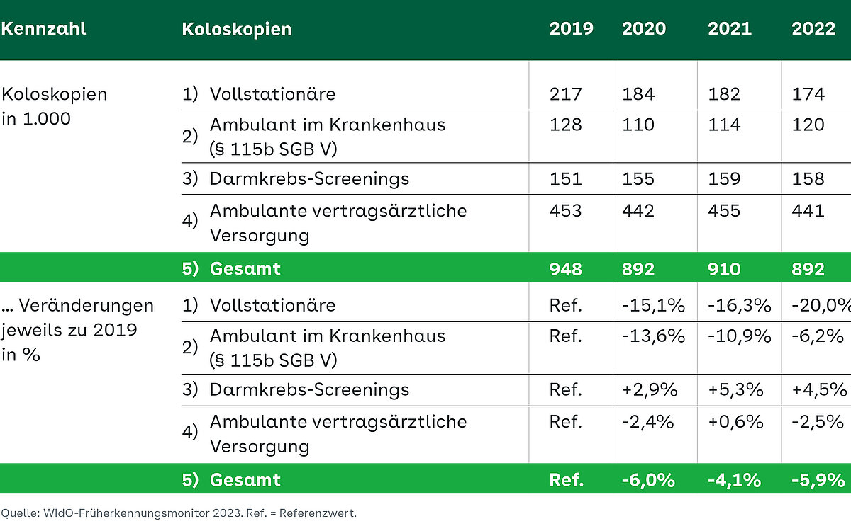 Ein Schwerpunkt des neuen „Früherkennungsmonitor“, den das WIdO zum diesjährigen „Tag der Krebsvorsorge“ veröffentlicht hat, liegt auf der Darmkrebs-Vorsorge Für die medizinische Vorsorge und die Rehabilitation gilt der Grundsatz ambulant vor stationär – das… . Hier werden die Auswirkungen der Pandemie auf die Früherkennungs-Koloskopien, aber auch auf die diagnostischen Darmspiegelungen analysiert. Die Auswertung zeigt, dass in den Jahren 2020 bis 2022 im Vergleich zu 2019 jeweils deutliche Rückgänge bei der Gesamtzahl der durchgeführten Koloskopien zu verzeichnen waren (Abbildung 2). Wenn man das Niveau im Jahr 2019, also vor der Pandemie, als Referenz nimmt, haben insgesamt 150.000 AOK-Versicherte weniger eine Koloskopie erhalten. „Wenn man von einer ähnlichen Entwicklung in der Gesamtbevölkerung ausgeht, können mehr als 400.000 Personen betroffen sein, die unter normalen Bedingungen eine Koloskopie erhalten hätten“, betont AOK-Vorstand Jens Martin Hoyer.