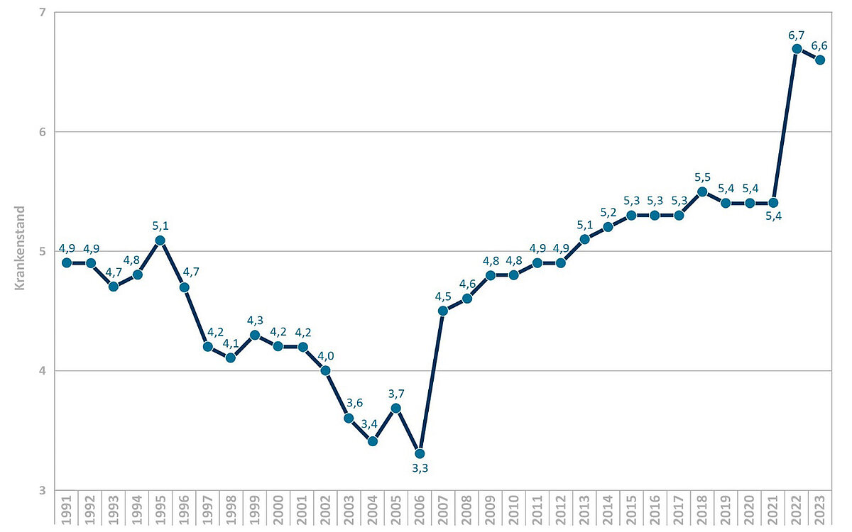 Allgemeiner Krankenstand 2023 etwas rückläufig, aber weiter auf sehr hohem Niveau