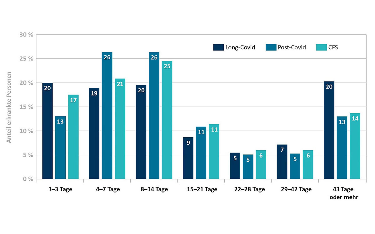 Um eine bestmögliche Schätzung der langfristigen Folgen von Covid-bedingten Erkrankungen zu ermöglichen und eine Unterschätzung des Erkrankungsgeschehens zu minimieren, wurden in den Analysen der Arbeitsunfähigkeitsdaten zusätzlich zur expliziten Diagnose „Post-Covid-Zustand“ (Diagnose-Code U07.4, U09 und U09.9) die Diagnosen Long-Covid und CFS berücksichtigt. Von einer Long-Covid-Erkrankung wird gesprochen, wenn die Beschwerden der Patientinnen und Patienten länger als 28 Tage andauern und im Zusammenhang mit einer Diagnose stehen, die vornehmlich zur Attestierung akuter Covid-Erkrankungen genutzt wird (Diagnose-Codes U07.1, U07.2, U07.3, U7.5, U08, U08.9, U10 und U10.9). Long-Covid-Erkrankungen werden in den Arztpraxen nicht als eigenständige Abrechnungsdiagnose dokumentiert. Vor diesem Hintergrund wurden bei der Berechnung der Falldauer von Long-Covid-Erkrankungen jeweils 28 Tage pro Fall abgezogen.