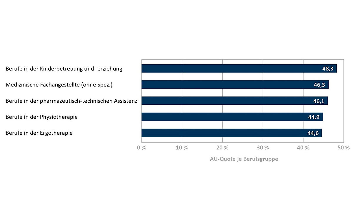 Wie frühere Auswertungen zeigt auch die aktuelle Analyse des WIdO, dass sowohl akute Covid-19-Infektionen als auch deren Spätfolgen am häufigsten unter Beschäftigten in Sozial- und Gesundheitsberufen diagnostiziert wurden. Bei den akuten Erkrankungen lagen Berufe in der Kinderbetreuung und -erziehung an der Spitze: Fast die Hälfte der Angehörigen dieser Berufsgruppe (48,3 Prozent) war zwischen März 2020 und Dezember 2023 mindestens einmal wegen einer akuten Covid-19-Infektion krankgeschrieben (Abbildung 4). Damit lagen sie deutlich über dem Durchschnittswert von 36,5 Prozent.
