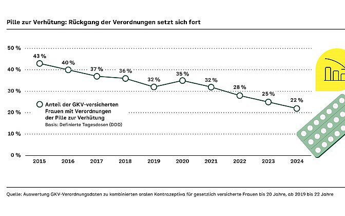 Im Jahr 2024 ließen sich nur noch 22 Prozent der unter 22-jährigen Frauen und Mädchen zur Empfängnisverhütung die Pille verschreiben. Zehn Jahre zuvor, im Jahr 2015, lag der Anteil noch bei 43 Prozent (Abbildung 1). Das zeigt eine aktuelle AOK Die AOK hat mit mehr als 20,9 Millionen Mitgliedern (Stand November 2021) als zweistärkste Kassenart… -Auswertung von GKV-Verordnungsdaten aus Anlass des 65. Jahrestages der Einführung der Pille als Verhütungsmittel.