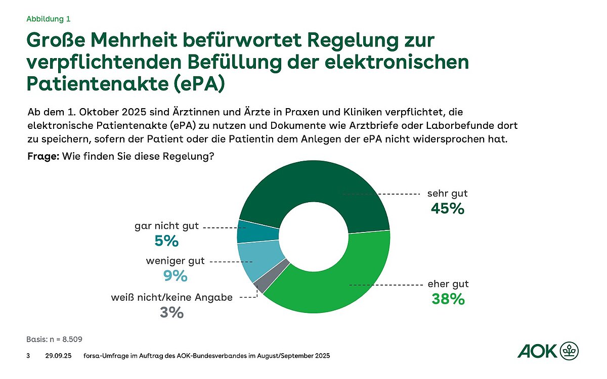 Ab Mittwoch (1. Oktober) sind die Ärztinnen und Ärzte in Praxen und Kliniken verpflichtet, die elektronische Patientenakte Mit der ePA können Patientinnen und Patienten sowie die an Ihrer Behandlung beteiligten Ärztinnen… (ePA) zu nutzen und Dokumente wie Arztbriefe oder Laborbefunde dort zu speichern. Laut einer vom AOK Die AOK hat mit mehr als 20,9 Millionen Mitgliedern (Stand November 2021) als zweistärkste Kassenart… -Bundesverband beauftragten forsa-Befragung befürwortet eine große Mehrheit der gesetzlich versicherten Menschen in Deutschland (83 Prozent) diese Regelung zur verpflichtenden Befüllung, nur 14 Prozent lehnen sie ab (Abbildung 1). Allerdings zeigt die Befragung nach wie vor viel Informationsbedarf beim Thema ePA.