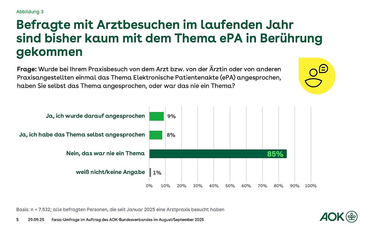 Die befragten Versicherten, die seit Januar 2025 in ärztlicher Behandlung waren, sind bisher kaum mit dem Thema elektronische Patientenakte Mit der ePA können Patientinnen und Patienten sowie die an Ihrer Behandlung beteiligten Ärztinnen… in Berührung gekommen: 84 Prozent der Menschen mit einem Arztbesuch im laufenden Jahr geben an, dass die ePA in der Arztpraxis bisher kein Thema gewesen sei (Abbildung 3). 9 Prozent berichten, dass sie schon vom Arzt Die ärztliche Berufsausübung, die Ausübung der Heilkunde, setzt nach der Bundesärzteordnung… , der Ärztin oder Praxisangestellten darauf angesprochen worden seien, 6 Prozent haben das Thema ePA selbst angesprochen. „Mit der Verpflichtung zur Befüllung und Nutzung der ePA ab dem 1. Oktober dürfte sich der Anteil der Versicherten, die mit dem Thema in Berührung kommen, deutlich erhöhen“, so die Prognose von AOK-Vorständin Reimann. „Erst mit der aktiven Befüllung durch Arztpraxen und Kliniken kann sich der Nutzwert der ePA wirklich entfalten. Schon heute berichten Ärztinnen und Ärzte beispielsweise, dass die automatisch befüllte Medikationsliste in der ePA einen besseren Überblick über Medikamente ermöglicht, die von Kolleginnen und Kollegen verordnet wurden. Wenn jetzt Dokumente wie Arztbriefe oder Laborbefunde hinzukommen und die letzten technischen Hürden überwunden sind, dürfte die Nutzung der elektronischen Patientenakte Mit der elektronischen Patientenakte (ePA) können Patientinnen und Patienten sowie die an ihrer… schnell zu einer selbstverständlichen Routine werden.“