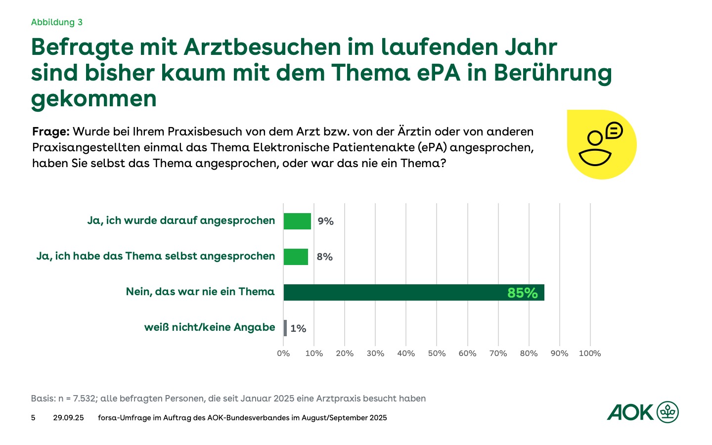 Die befragten Versicherten, die seit Januar 2025 in ärztlicher Behandlung waren, sind bisher kaum mit dem Thema elektronische Patientenakte Mit der ePA können Patientinnen und Patienten sowie die an Ihrer Behandlung beteiligten Ärztinnen… in Berührung gekommen: 84 Prozent der Menschen mit einem Arztbesuch im laufenden Jahr geben an, dass die ePA in der Arztpraxis bisher kein Thema gewesen sei (Abbildung 3). 9 Prozent berichten, dass sie schon vom Arzt Die ärztliche Berufsausübung, die Ausübung der Heilkunde, setzt nach der Bundesärzteordnung eine… , der Ärztin oder Praxisangestellten darauf angesprochen worden seien, 6 Prozent haben das Thema ePA selbst angesprochen. „Mit der Verpflichtung zur Befüllung und Nutzung der ePA ab dem 1. Oktober dürfte sich der Anteil der Versicherten, die mit dem Thema in Berührung kommen, deutlich erhöhen“, so die Prognose von AOK-Vorständin Reimann. „Erst mit der aktiven Befüllung durch Arztpraxen und Kliniken kann sich der Nutzwert der ePA wirklich entfalten. Schon heute berichten Ärztinnen und Ärzte beispielsweise, dass die automatisch befüllte Medikationsliste in der ePA einen besseren Überblick über Medikamente ermöglicht, die von Kolleginnen und Kollegen verordnet wurden. Wenn jetzt Dokumente wie Arztbriefe oder Laborbefunde hinzukommen und die letzten technischen Hürden überwunden sind, dürfte die Nutzung der elektronischen Patientenakte Mit der elektronischen Patientenakte (ePA) können Patientinnen und Patienten sowie die an ihrer… schnell zu einer selbstverständlichen Routine werden.“