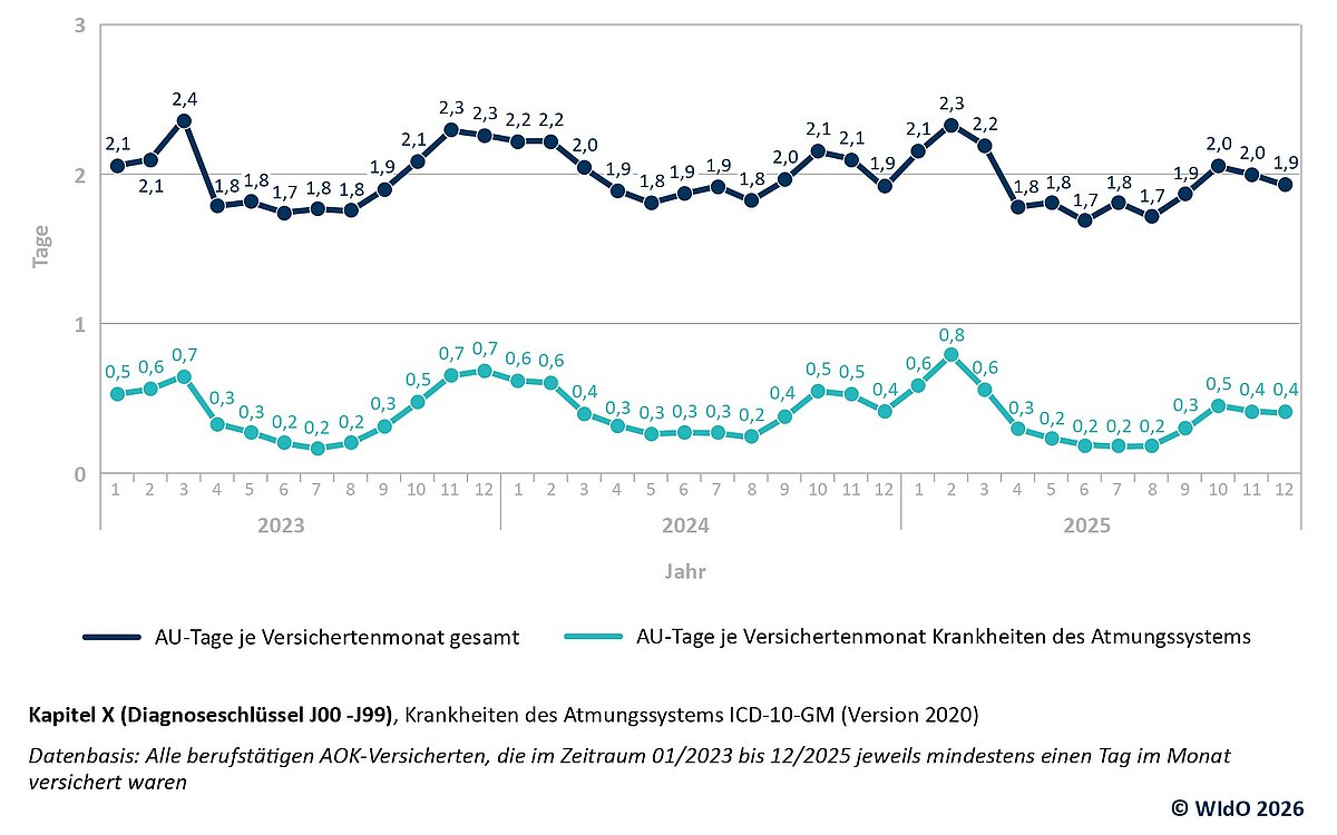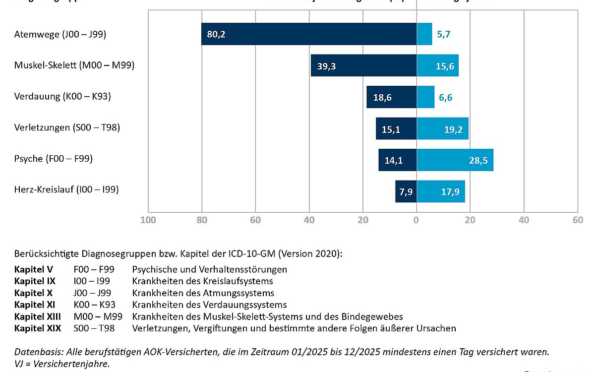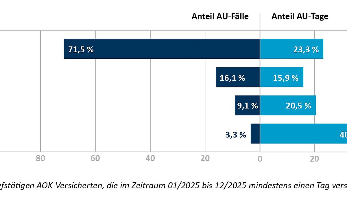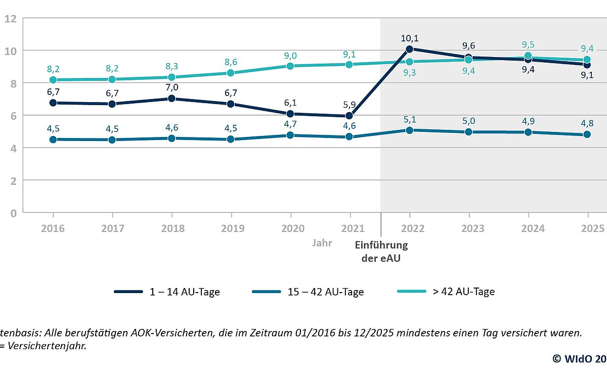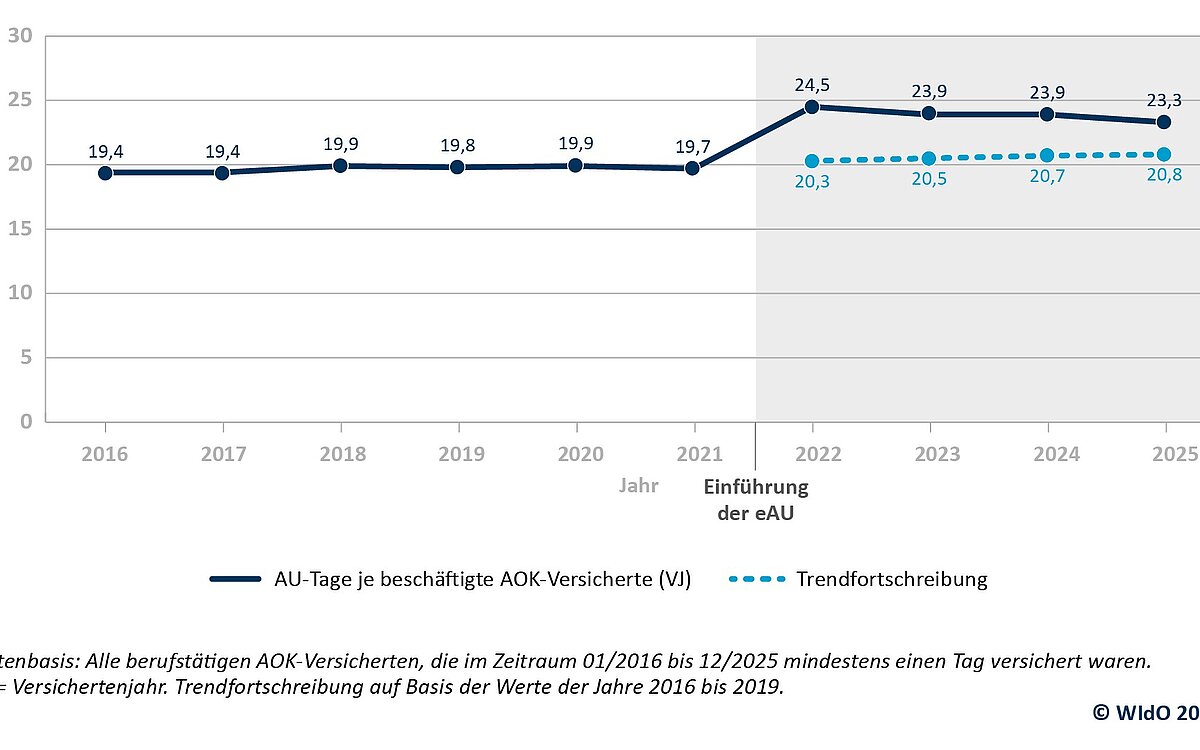 Im Jahr 2025 sind die bei der AOK versicherten Beschäftigten im Durchschnitt 23,3 Tage krankheitsbedingt ausgefallen. Damit liegen die Fehlzeiten leicht unter dem Niveau des Vorjahres mit 23,9 Krankheitstagen und etwa einen Tag unter dem bisherigen historischen Höchststand von 2022 mit 24,5 Tagen. Die Analyse des Wissenschaftlichen Instituts der AOK (WIdO) zeigt, dass das hohe Niveau der Fehlzeiten seit 2022 in erster Linie durch einen statistischen Effekt infolge der Einführung der elektronischen Arbeitsunfähigkeitsbescheinigung (eAU) zu erklären ist. Die eAU hat dazu geführt, dass insbesondere kurzzeitige Erkrankungen vollständiger erfasst worden sind.