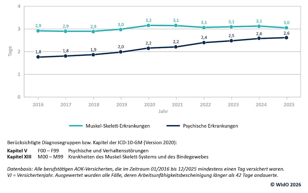 Neben der Einführung der eAU und der erhöhten Prävalenz von Atemwegserkrankungen seit der Covid-19-Pandemie gibt es weitere Faktoren, die zu einem Anstieg der Fehlzeiten beitragen. Dazu gehört laut der WIdO-Analyse vor allem der stetige Anstieg von Erkrankungen mit einer Dauer von über sechs Wochen. Sie machen mit 3,3 Prozent zwar nur einen relativ geringen Anteil der AU-Fälle aus, verursachen aber den höchsten Anteil der AU-Tage (über 40 Prozent, Abbildung 5). Zum Vergleich: Die kurzen Erkrankungen bis zu sieben Tagen verursachen 71 Prozent der AU-Fälle, machen aber nur 23 Prozent der AU-Tage aus. Bei den Diagnosegruppen mit langer Erkrankungsdauer liegen die Muskel-Skelett-Erkrankungen seit Jahren auf hohem Niveau. Der größte Treiber für den Anstieg der Langzeiterkrankungen sind jedoch die psychischen Erkrankungen: Laut der aktuellen WIdO-Auswertung sind die AU-Tage, die durch psychische Erkrankungen von mehr als sechs Wochen verursacht wurden, zwischen 2016 und 2025 stark gestiegen (Abbildung 6). Im Vergleich zu den anderen Diagnosegruppen sind die psychischen Erkrankungen mit durchschnittlich 28,5 Arbeitsunfähigkeitstagen je Fall zudem mit den längsten Ausfallzeiten verbunden (Abbildung 7). „Hier kann die betriebliche Gesundheitsförderung Ansätze bieten, um die Widerstandsfähigkeit und psychische Belastbarkeit von Beschäftigten zu stärken. Eine transparente, partizipative und gesundheitsorientierte Unternehmenskultur und Führung sind zentrale Stellschrauben, um Mitarbeitende gesund zu erhalten und langfristig an die Unternehmen zu binden. Das zeigen immer wieder die Analyse-Ergebnisse der Fehlzeiten-Reporte der vergangenen Jahre“, so Schröder.