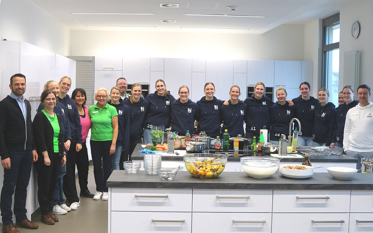 Heilbronn. Mit einem gemeinsamen Ernährungsworkshop inklusive Kochkurs setzten die Sport-Union Neckarsulm (SUN) und die AOK Die AOK hat mit mehr als 20,9 Millionen Mitgliedern (Stand November 2021) als zweistärkste Kassenart… Heilbronn-Franken ein weiteres Zeichen für gelebte Gesundheitsförderung ist ein fortlaufender Prozess mit dem Ziel, allen Menschen ein höheres Maß an Selbstbestimmung über… . Die Veranstaltung für die 1. Damenmannschaft fand im Gesundheitszentrum der AOK Heilbronn-Franken in Heilbronn statt und ist Teil der seit 2018 bestehenden Kooperation beider Partner. Ziel des Workshops war neben einem Vortrag zum Thema Ernährung und Regeneration auch das Teambuilding beim gemeinsamen Kochen.