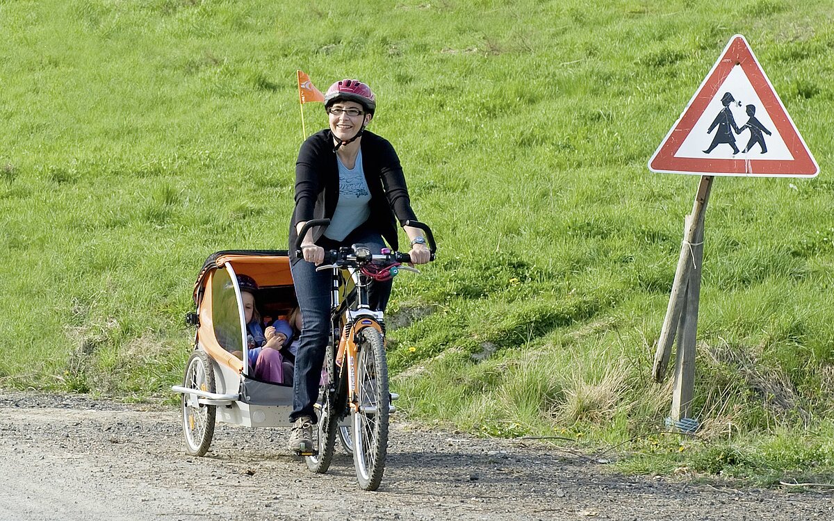 Frau auf Fahrrad mit einem Kind im Anhänger