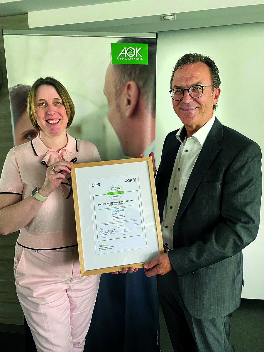 „Unsere Vision ist es, ein Arbeitsumfeld zu schaffen, in dem sich alle wohlfühlen und ihre Leistungsfähigkeit voll entfalten können“, sagte Vorständin Beatrix Vogt-Wuchter beim Empfang des Zertifikats im „Haus der Diakonie“. Der stellvertretende Geschäftsführer der AOK Mittlerer Oberrhein zeigte sich begeistert: „Die Diakonie Baden ist das erste Unternehmen im Stadtkreis Karlsruhe, das diese Auszeichnung erhält“, so Bernhard Ibach. Das AOK-Audit für betriebliche Gesundheit unterstützt Unternehmen dabei, nachhaltige Strukturen für das Betriebliche Gesundheitsmanagement (BGM) zu schaffen. Die erste Bonuszahlung der AOK für die Diakone über 3.000 Euro floss im Jahr 2022 in die Ausbildung von 15 Mitarbeitenden, die sich zu Ersthelfern für psychische Gesundheit ausbilden ließen. „Darüber freuen wir uns sehr. Über das große Interesse unserer Mitarbeitenden und dass wir dieses Projekt für unser Haus ermöglichen konnten“, so Vorständin Vogt-Wuchter.