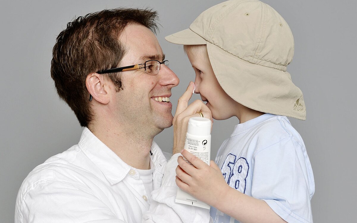 Cremen Sie Ihren Nachwuchs zusätzlich mit einem für Kinder geeigneten Sonnenschutzmittel ab LSF 30 ein, das vor UV-A- und UV-B-Strahlen schützt. Cremes und Lotionen sind Gels oder Produkten auf Alkoholbasis vorzuziehen, da letztere die Haut austrocknen. Beim Baden unbedingt ein wasserfestes Produkt wählen. Großzügig eingecremt wird vor dem Aufenthalt im Freien, außerdem nach jedem Baden, Abtrocknen oder Schwitzen. Regelmäßiges Nachcremen nicht vergessen und abends eine Feuchtigkeitscreme benutzen! Wichtig ist darüber hinaus eine gut sitzende Kindersonnenbrille, da Kinderaugen oft noch nicht über eine ausreichend schützende Pigmentierung verfügen. Beim Kauf auf die Zeichen „UV 400“ sowie „CE“ achten.