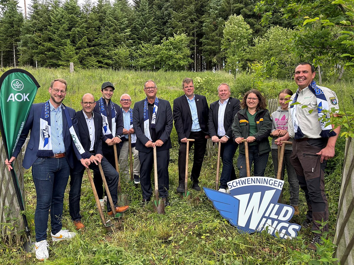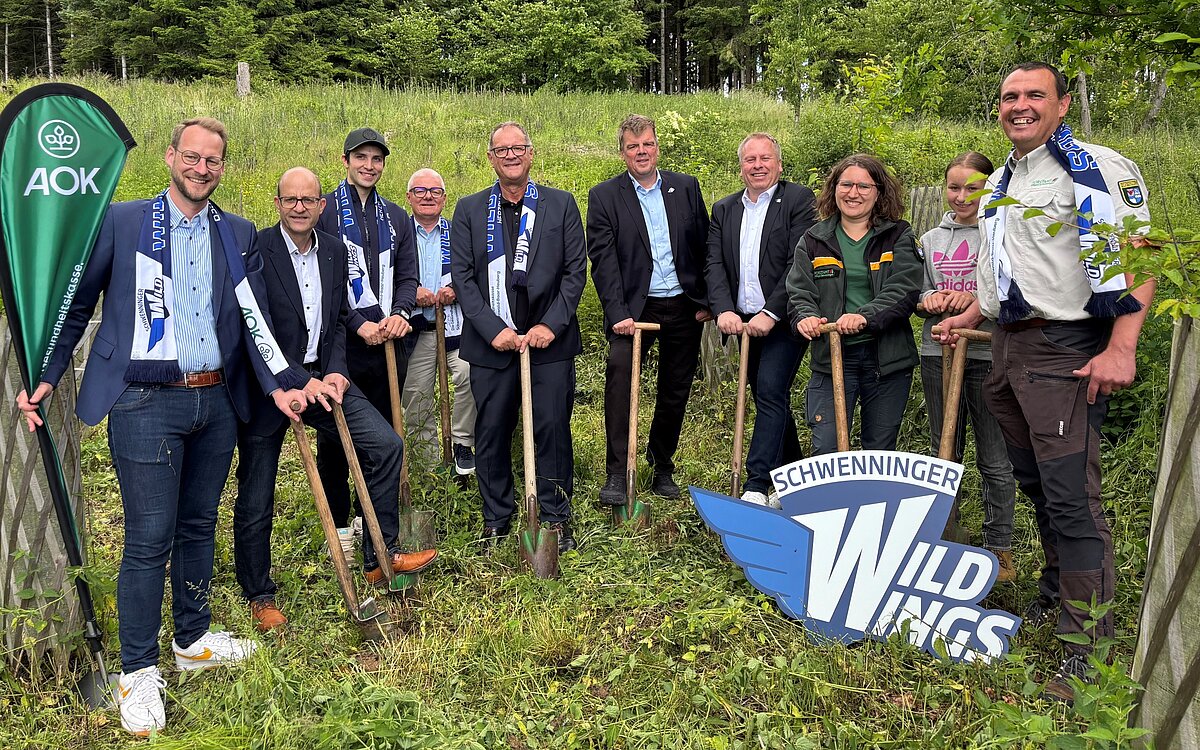Beim Auftakt setzten Oberbürgermeister Jürgen Roth, WILD WINGS-Geschäftsführer Stefan Wagner, Eishockeyspieler Phil Hungerecker, Harald Rettenmaier, Geschäftsführer der AOK Schwarzwald-Baar-Heuberg, Markus Fink, Vorsitzender des AOK-Bezirksrats und Roland Brauner, stellvertretender Amtsleiter des Forstamtes, gemeinsam mit weiteren Vertretern der AOK, der WILD WINGS sowie des Forstamtes den ersten Spatenstich als sichtbares Zeichen für das gemeinsame Engagement in Sachen Nachhaltigkeit. Die Bäume werden im Herbst gepflanzt, wenn die Witterungsbedingungen so sind, dass sie besser anwachsen können.