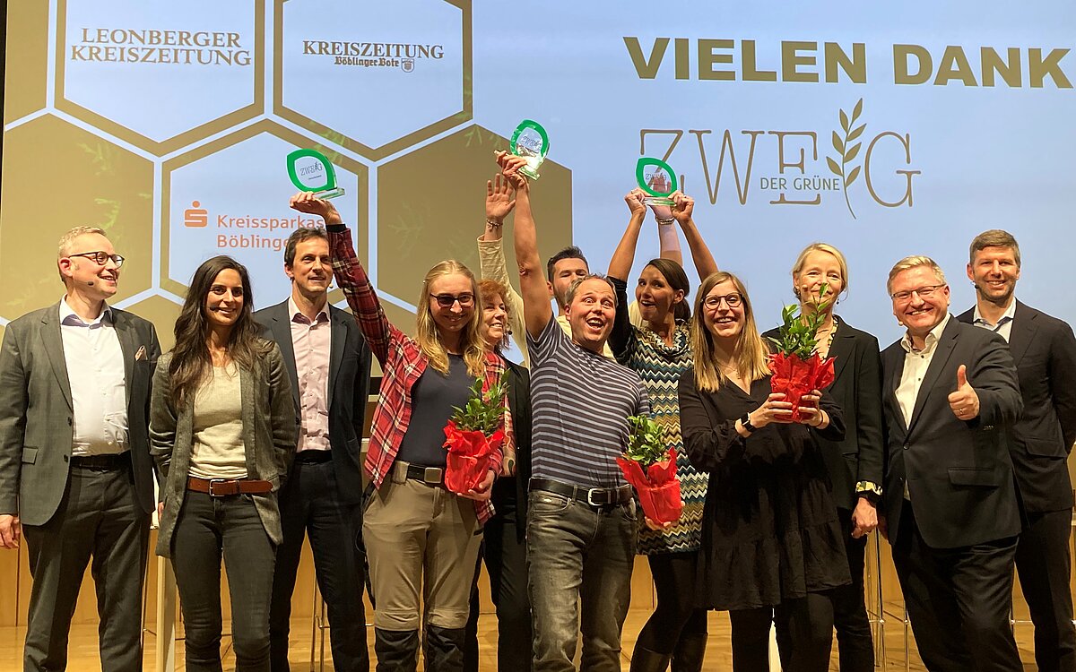 Höhepunkt des Abends war die Preisverleihung „Der Grüne Zweig“ für innovative und nachhaltige Projekte aus dem Landkreis Böblingen. Alle eingereichten Projekte wurden von einer Fachjury aus der Wissenschaft und Forschung bewertet. Welches Projekt die Auszeichnung den „Grünen Zweig“ erhält, wurde von Bürgerinnen und Bürger aus dem Landkreis Böblingen bei einer Online-Abstimmung entschieden. Über 7.000 Stimmen wurden gezählt. Mit einer deutlichen Mehrheit standen die Siegerinnen und Sieger des ersten „Grünen Preises“ fest. In der Kategorie „Unternehmen“ gewann die „Wilde Farm“ aus Herrenberg-Kuppingen. Die „Lebenshilfe Böblingen und Lebenshilfe Leonberg“ waren gemeinsam die Sieger in der Kategorie „Kommunen/Schulen“. Die „Offene Werkstatt Böblingen“ nahm den Preis in der Kategorie „Ehrenamt“ entgegen. Alle Siegerinnen und Sieger freuten sich über ein Preisgeld jeweils in Höhe von 3.333 Euro für ihre innovativen und nachhaltigen Projekte.