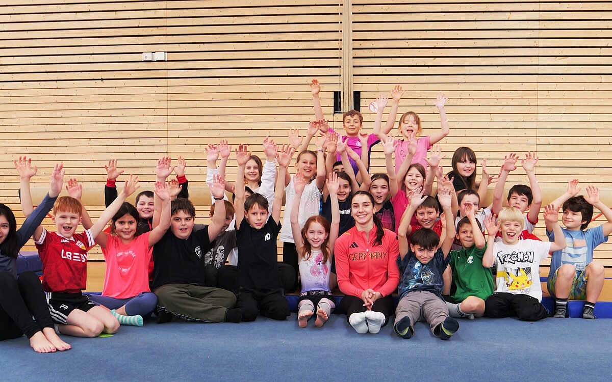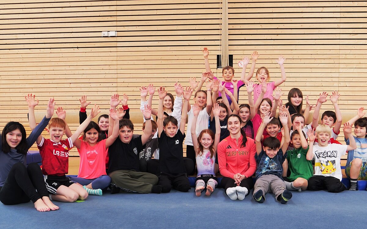 Für die 30 Grundschülerinnen und Grundschüler ist es keine gewöhnliche Turnstunde in der Ammertalhalle. Denn mit ihnen auf der Matte ist die deutsche Profi-Turnerin Helen Kevric, die bei den olympischen Sommerspielen 2024 den sechsten Platz am Stufenbarren und den achten Platz im Mehrkampf belegt hatte. Die Turnstunde mit den Viertklässlern startet sie mit einem spielerischen Aufwärmprogramm. Lauf- und Koordinationsübungen sowie Dehnübungen bereiten die Kinder auf die anschließenden Turnübungen vor. „Ein gutes Aufwärmen ist wichtig – nicht nur im Leistungssport, sondern bei jeder Sportart“, erklärt Helen Kevric den Schülerinnen und Schülern.