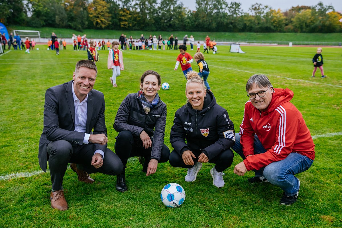 Rund 100 Kinder aus 12 Stuttgarter Kindertagesstätten verwandelten am Freitagnachmittag (10.10.2025) das Stadion Festwiese in ein fröhliches Spielfeld. Mit dabei: Leonie Maier, ehemalige deutsche Fußballnationalspielerin, die die kleinen Kicker vom Spielfeldrand aus unterstützte.