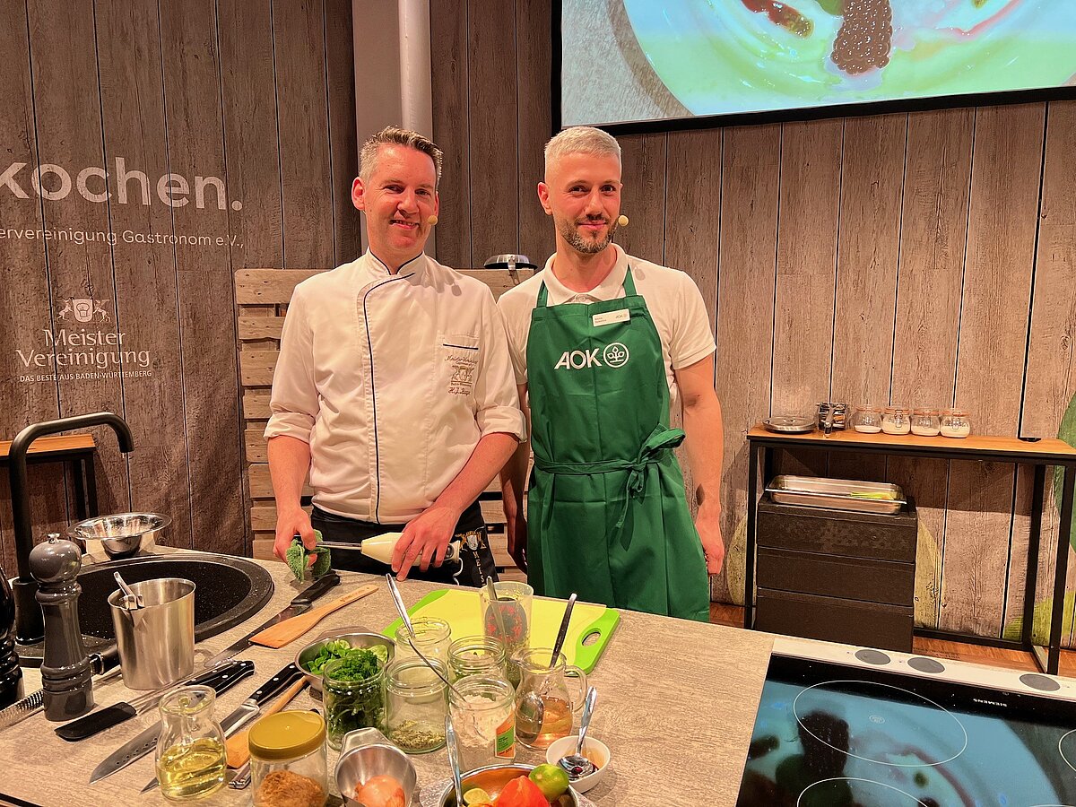 Mit spürbarer Freude am Kochen und einer Prise Humor stand Küchenprofi Hans Joachim Burger am Herd, während AOK-Ernährungsexperte Nikita Sabatino mit fachkundigem Wissen charmant für die passende Würze sorgte. Die beiden bildeten ein starkes Duo – ein perfekt abgeschmecktes Team. Ihre lockeren Dialoge („Was ist der Unterschied zwischen Zwetschgen und Pflaumen? – Die Schreibweise!“) sorgten immer wieder für herzliche Lacher im Publikum.