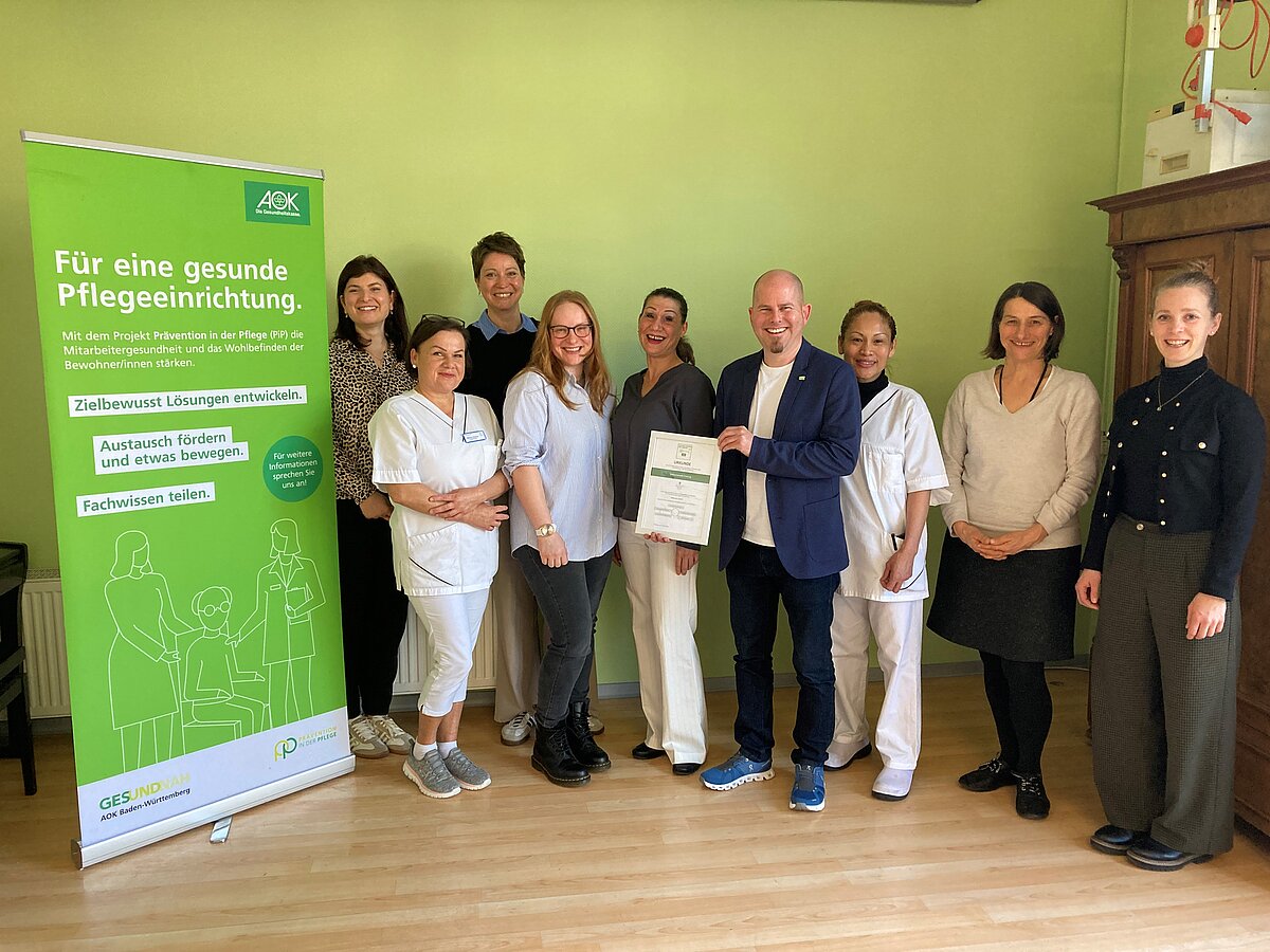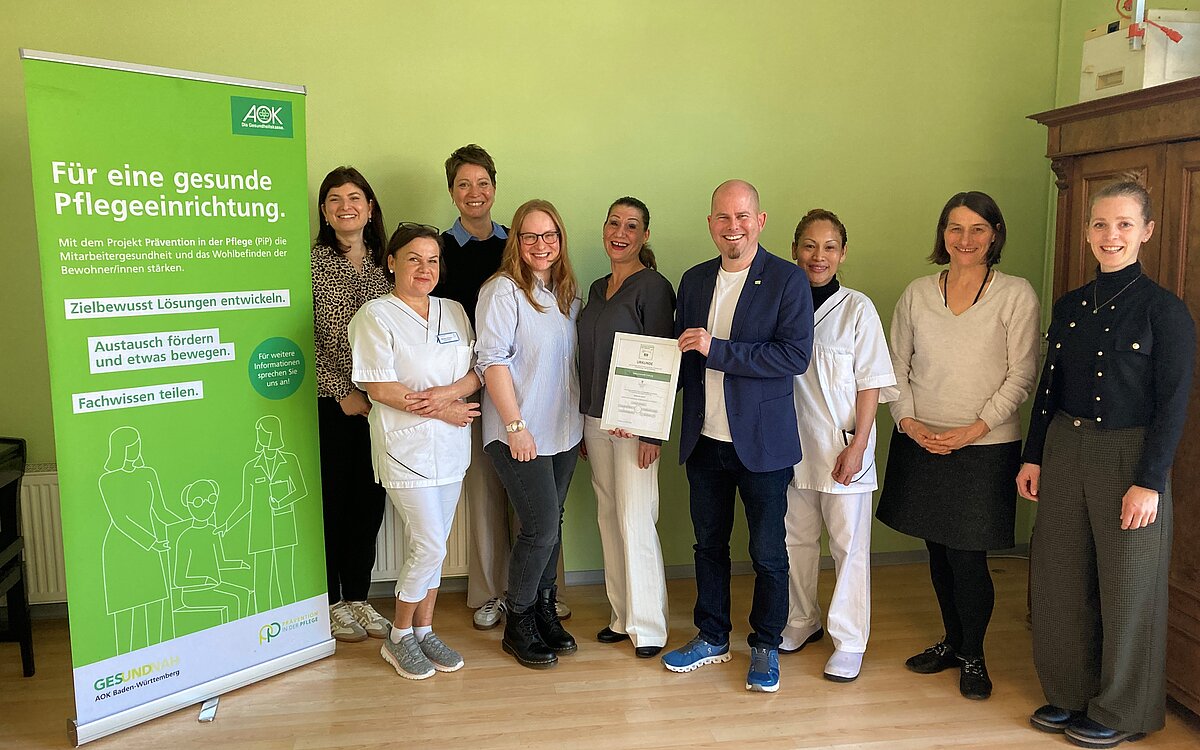 Aufbauend auf das Projekt „Prävention in der Pflege (PiP) wurde das Siegel GESUNDES WOHNEN UND ARBEITEN entwickelt. Die AOK Baden-Württemberg bescheinigt im Rahmen eines Prüfverfahrens, dass die Pflegeeinrichtung in der Gesundheitsförderung und Organisationsentwicklung ein ausgezeichnetes Ergebnis erzielt hat. Geprüft werden verschiedene Qualitätskriterien in den Bereichen Strukturaufbau, Umsetzung von Maßnahmen, Koordination des Prozesses, Kommunikation an alle Beteiligte und Wirksamkeit des Handelns.