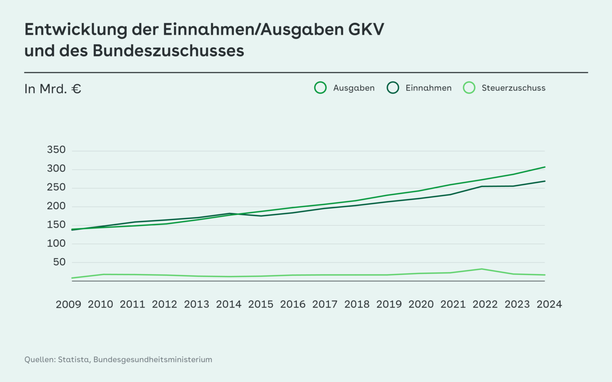 Da sich im gleichen Zeitraum die Ausgaben der GKV stetig erhöhten und 2024 laut GKV-Schätzerkreis bei 313,7 Milliarden Euro liegen werden, ist der Anteil des Bundeszuschusses an den Gesundheitskosten entsprechend gesunken. 2010 machte der Bundeszuschuss 9,2 Prozent der Ausgaben aus, 2024 wird er voraussichtlich nur noch 4,6 Prozent erreichen, gerade mal die Hälfte. Die Ausgaben haben sich im selben Zeitraum fast verdoppelt.
