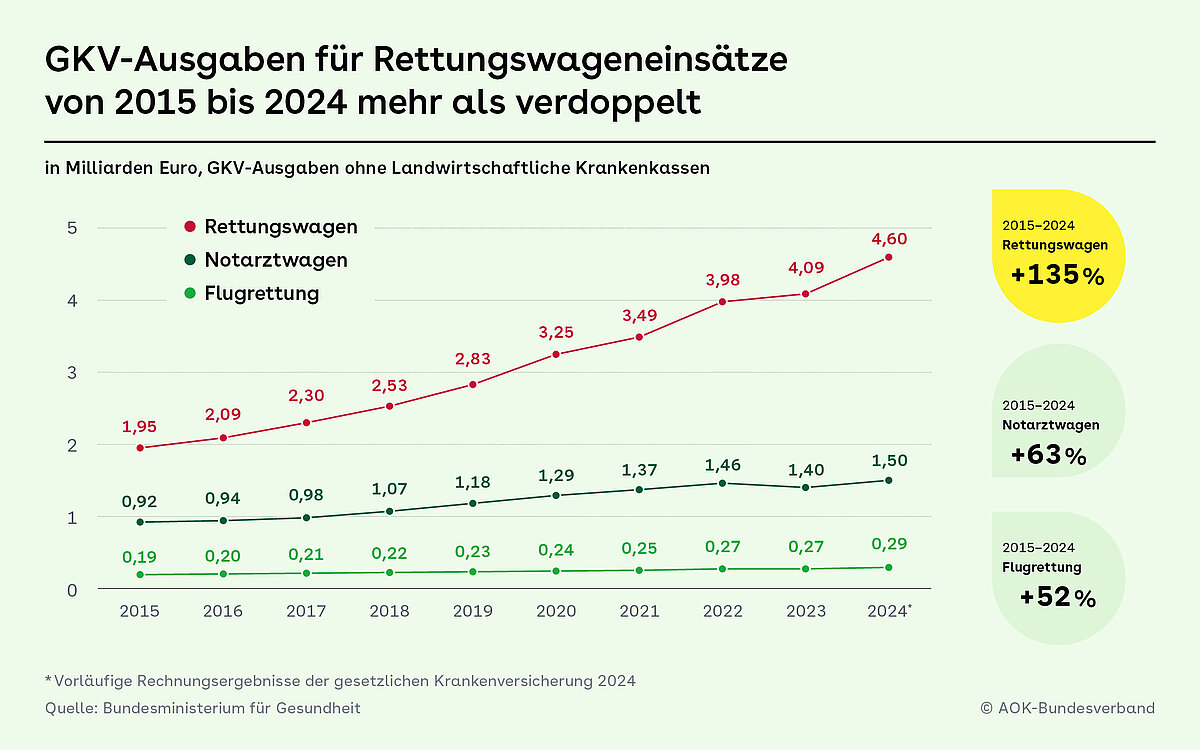 Die hohen Ausgaben der GKV durch den Rettungsdienst sind nicht allein auf die hohe Einsatzzahl und das gestiegene Personalvolumen zurückzuführen. Laut Kraftfahrt-Bundesamt sind 2024 im Vergleich zu 2015 rund 20 Prozent mehr Krankenwagen und Notarzteinsatzfahrzeuge auf der Straße – im Notfalleinsatz ausgestattet mit modernster Technik für invasive Behandlungen im Wagen oder vor Ort.