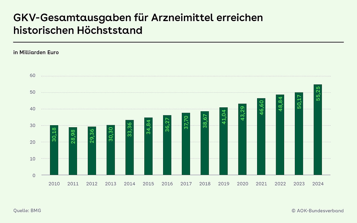 Laut den vorläufigen Daten aus dem Bundesministerium für Gesundheit (BMG) für 2024 (KV 45) nahmen die gesetzlichen Krankenkassen im vergangenen Jahr 320,6 Milliarden Euro ein, während ihre Ausgaben bei 326,9 Milliarden lagen. Besonders hoch war der Ausgabenanstieg bei Arzneimitteln.