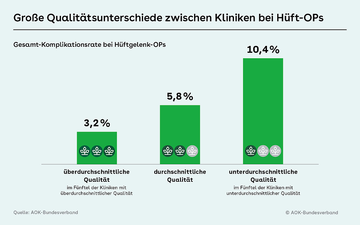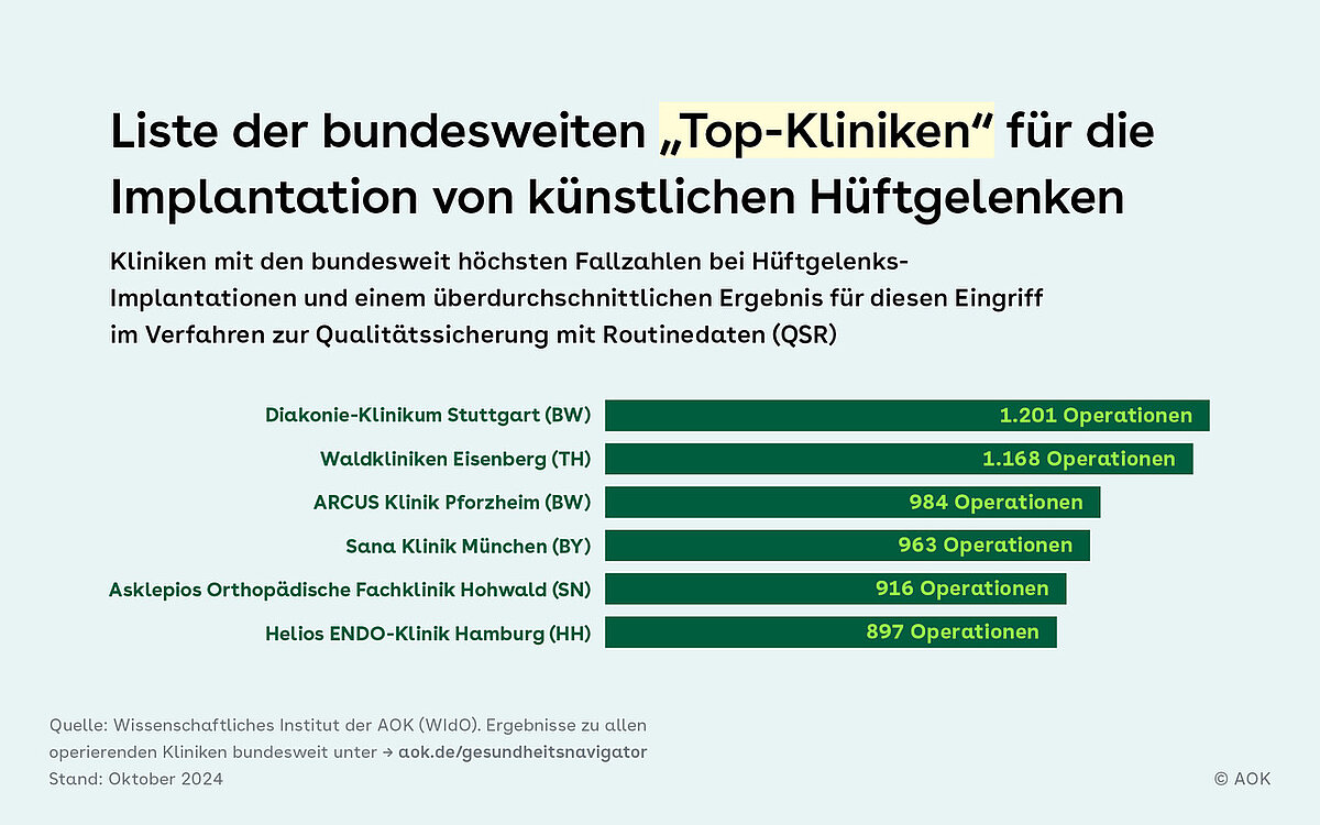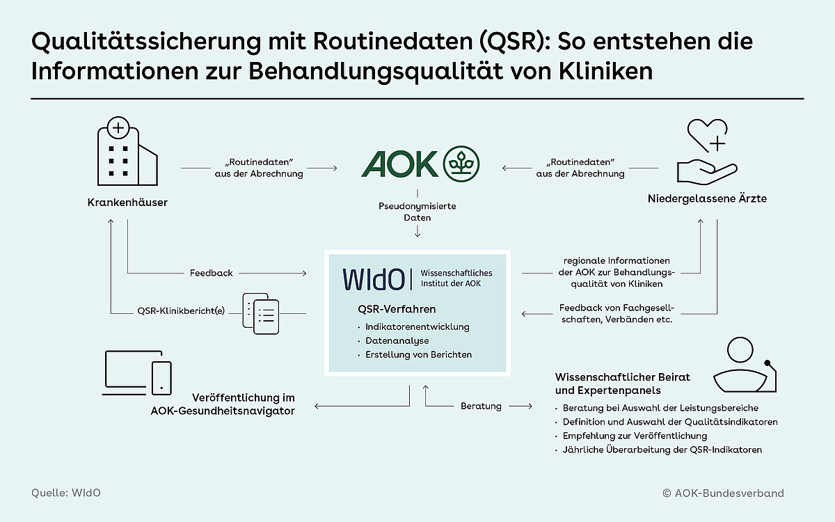 Um die Qualität von Operationen zu messen, haben das Wissenschaftliche Institut der AOK (WIdO) und der Klinikbetreiber Helios seit 2003 das Verfahren „Qualitätssicherung mit Routinedaten“ entwickelt. Dabei werden Abrechnungsdaten verwendet, die im Rahmen einer Behandlung im Krankenhaus oder beim Vertragsarzt ohnehin erhoben werden. Das ermöglicht es, den Verlauf einer Behandlung über den Klinikaufenthalt hinaus zu verfolgen und so die Qualität eines Eingriffs zu bewerten. Die Ergebnisse zu allen bewerteten Operationen und Eingriffen werden für jede einzelne Klinik im Gesundheitsnavigator der AOK dargestellt. Sie werden nach Eingabe der entsprechenden Behandlung in der Krankenhaus-Suche automatisch angezeigt.