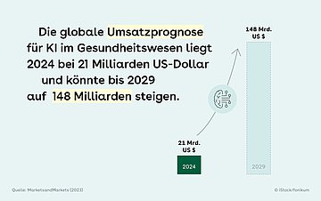 KI-Anwendungen im Gesundheitswesen haben ein großes wirtschaftliches Potenzial. Eine Studie des Marktforschungs- und Beratungsunternehmens MarketsandMarkets prognostiziert für das Jahr 2024 einen weltweiten Umsatz von 21 Milliarden US-Dollar mit einer geschätzten Umsatzsteigerung auf 148 Milliarden US-Dollar bis 2029.