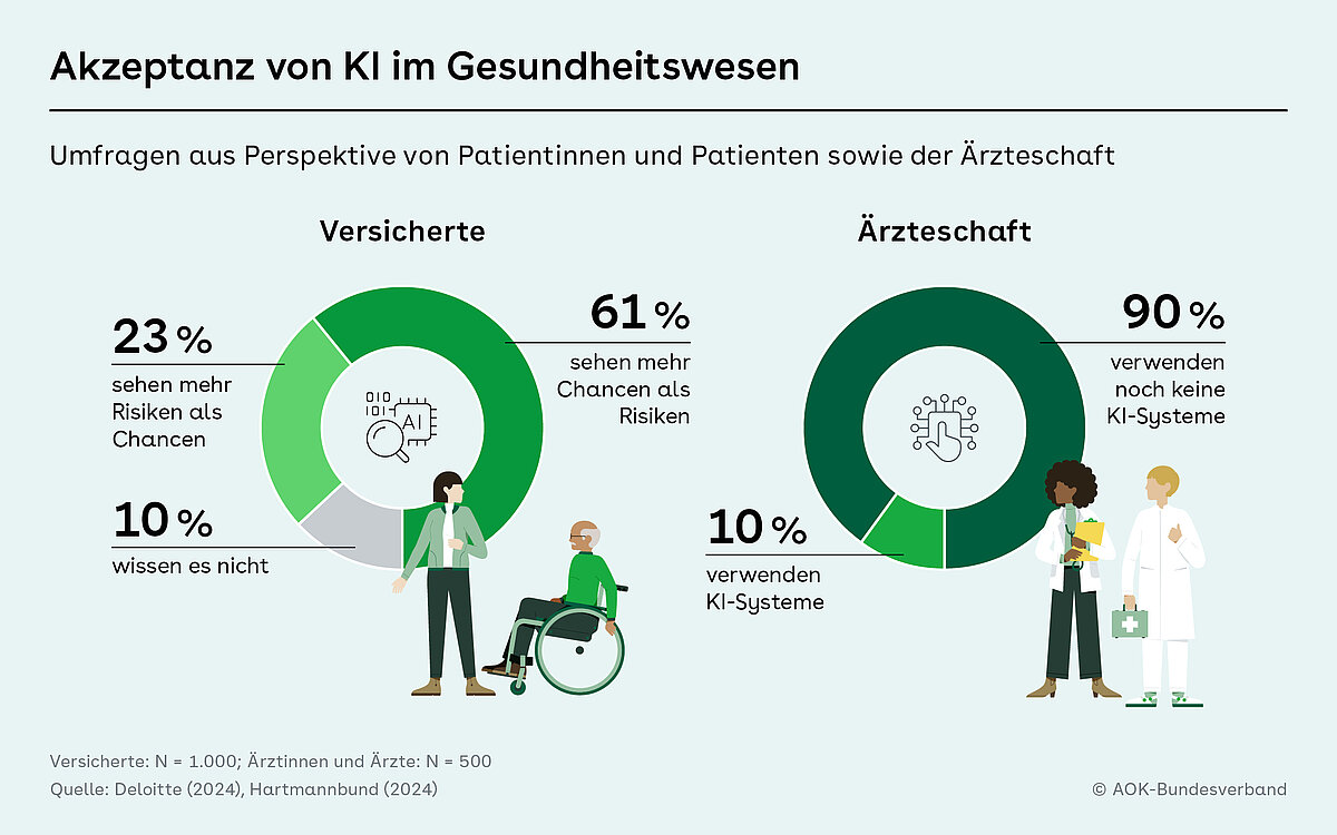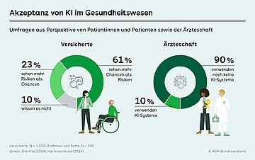 Mehr als 60 Prozent der Versicherten sehen in der KI-Nutzung für die Patientenversorgung in einer Befragung des Beratungsunternehmens und Wirtschaftsprüfers Deloitte mehr Chancen als Risiken. Sie haben laut der Studie hohe Erwartungen an KI in der Medizin, besonders hinsichtlich der Behandlungsqualität und dem Wunsch, durch eine höhere Effizienz mehr Zeit im Gespräch mit der Ärztin oder dem Arzt verbringen zu können. Jedoch nutzen laut einer Umfrage des Hartmannbundes derzeit nur rund zehn Prozent der Ärzteschaft KI-Systeme. Der Digitalisierung im Gesundheitswesen stehen der Untersuchung zufolge unter anderem eine mangelnde technische Ausstattung sowie veraltete IT-Infrastrukturen im Wege.