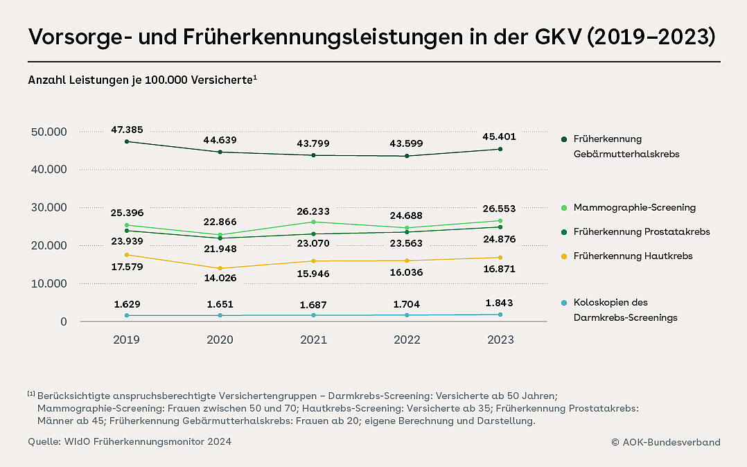 Corona-bedingt haben zwischen 2020 und 2021 weniger Menschen die Früherkennungsuntersuchungen wahrgenommen. Inzwischen verzeichnen alle fünf Untersuchungen einen Aufwärtstrend. Teils liegen die Teilnahmezahlen sogar über dem Niveau von 2019. Das zeigt der „Früherkennungsmonitor 2024“ des Wissenschaftlichen Instituts der AOK (WIdO). Da es für die einzelnen Untersuchungen unterschiedliche Voraussetzungen und Intervalle gibt, beziehen sich die Angaben auf Untersuchungen pro 100.000 Versicherte.