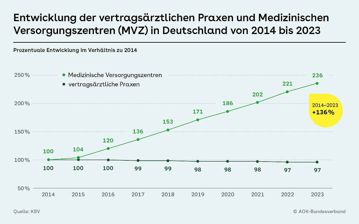 Im Jahr 2023 lag die Anzahl der zugelassenen MVZ laut KBV bei 4.897. Im Vergleichszeitraum von 2014 (mit 2.073 MVZ) bis 2023 (siehe Grafik) bedeutet dies eine Zunahme von rund 136 Prozent. Zum Vergleich: 2023 gab es insgesamt 98.985 vertragsärztliche Arztpraxen, das heißt Einzel- und Gemeinschaftspraxen ohne MVZ. Ihre Anzahl sank jedoch im Zeitraum von 2014 bis 2023 um rund drei Prozent. 2014 waren es noch 102.336 Praxen.