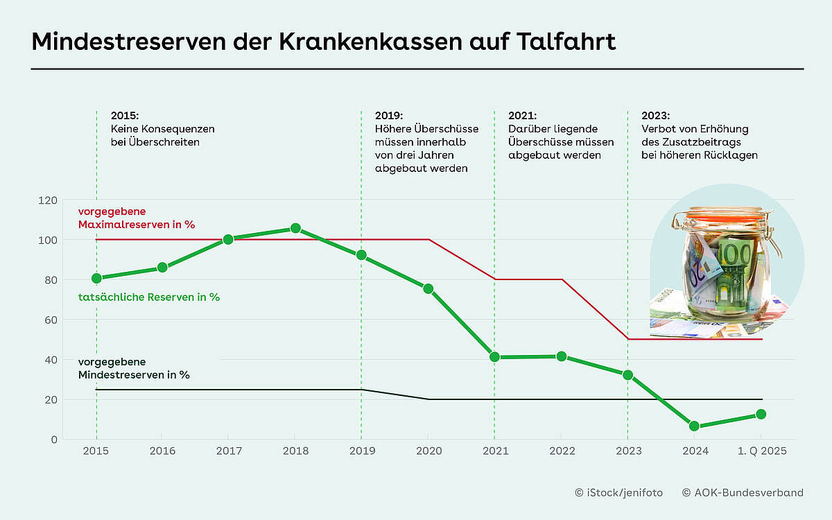 Die Folgen einer solchen Sparpolitik auf Kassenkosten waren zum Jahresanfang 2025 die bislang höchsten Anhebungen der Zusatzbeiträge. Die liegen im Schnitt nun bei mehr als 2,9 Prozent. Auch der erzwungene Abbau der Rücklagen hat zu einem Negativ-Rekord geführt: Sie lagen Ende 2024 über alle Kassen hinweg bei sechs Prozent anstelle der vorgeschriebenen 20 Prozent. Zum Ende des ersten Quartals 2025 sind die Rücklagen zwar auf zwölf Prozent gestiegen, liegen aber noch immer unter der Mindestreserve. Einen Puffer, um Ausgabensteigerungen aufzufangen, haben die Kassen noch nicht wieder aufbauen können.