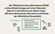 Der Öffentliche Gesundheitsdienst (ÖGD) hat nicht nur wichtige staatliche Aufgaben zum allgemeinen Gesundheitsschutz, sondern sorgt gemäß dem Präventionsgesetz mit den gesetzlichen Krankenkassen auch für Prävention und Gesundheitsförderung zum Wohle der Bevölkerung in Ländern und Kommunen. Er umfasst Einrichtungen der Gesundheitsverwaltung auf allen föderalen Ebenen. Auf Bundesebene gehören etwa das Bundesgesundheitsministerium (BMG), Bundesbehörden wie das Bundesinstitut für Öffentliche Gesundheit (BIÖG), das Robert-Koch-Institut (RKI) oder das Paul-Ehrlich-Institut (PEI) zum ÖGD. Auf Länderebene sind dies die Ländergesundheitsministerien und Landesämter oder -institute für Gesundheit, und kommunal sind die circa 380 Gesundheitsämter zuständig.