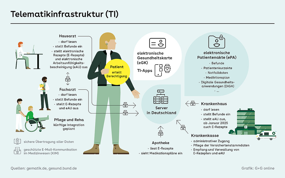Vom E-Rezept bis zur „elektronischen Patientenakte (ePA) für alle“: Die Telematikinfrastruktur (TI) ist die Grundlage für die Digitalisierung des deutschen Gesundheitswesens. Über die TI können Ärzte, Apotheken, Kliniken und Krankenkassen nach Einwilligung der Patienten medizinische Daten verschlüsselt austauschen sowie untereinander und mit den Versicherten kommunizieren. Dabei haben sie unterschiedliche Befugnisse und Zugangsrechte – mit strengen Anforderungen an den Datenschutz.