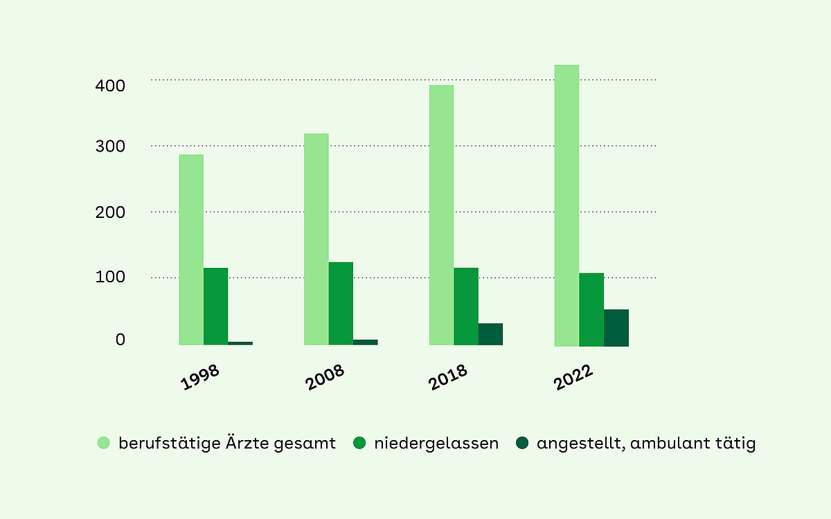 Die Zahl der berufstätigen Ärtzinnen und Ärzte ist in den vergangenen 25 Jahren um nahezu 50 Prozent gestiegen. Der Anteil der Niedergelassenen mit eigenen Praxen ist dabei leicht zurückgegangen, während es heute rund siebenmal so viele angestellte Ärztinnen und Ärzte gibt wie 1998.