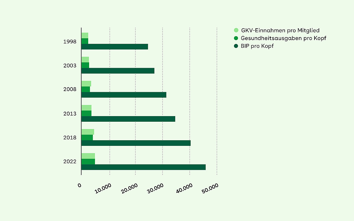Die Leistungsausgaben der GKV sind im Verlauf der zurückliegenden Jahre kontinuierlich angestiegen und erreichten im Jahr 2022 den Betrag von rund 288,9 Milliarden Euro. Allerdings ist der Anteil der GKV-Ausgaben am BIP im Zeitverlauf weitgehend konstant geblieben – von den Sondereffekten wegen der Corona-Pandemie mal abgesehen. Die Finanzierungsprobleme in der gesetzlichen Krankenversicherung sind vielmehr strukturell und darauf zurückzuführen, dass die Finanzierungsbasis der GKV (versicherungspflichtige Entgelte der Arbeitnehmer sowie Renten) nicht proportional mit dem Anstieg des Sozialprodukts und der Leistungsausgaben mitgewachsen ist.