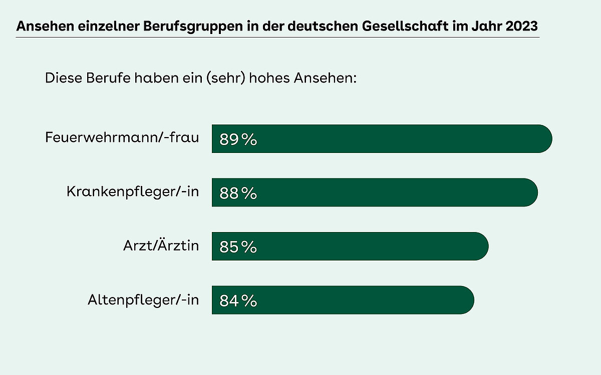 Wie bereits in den Vorjahren lagen Kranken- und Altenpflege auf den Plätzen zwei und vier des Berufsrankings – hinter den Feuerwehrleuten und der Ärzteschaft. So gaben knapp neun von zehn befragten Personen an, dass Krankenpflegekräfte ein sehr hohes oder hohes Ansehen in der Gesellschaft haben. Bei Altenpflegekräften waren es acht von zehn Befragten.