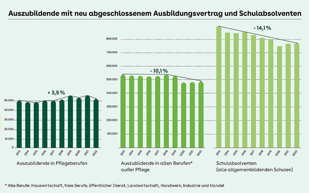 In Deutschland gibt es für den Pflegeberuf nach wie vor ein großes Ausbildungsinteresse. Das zeigen die Zahlen des Statistischen Bundesamtes für die Jahre 2013 bis 2022. Demnach ist die Zahl der abgeschlossenen Ausbildungsverträge in diesem Zeitraum um 3,5 Prozent gestiegen. Gleichzeitig ging die Zahl der Schulabsolventen um 14 Prozent zurück. Die Ausbildungszahlen in allen anderen Bereichen der dualen Berufsausbildung sanken ebenfalls um zehn Prozent.
