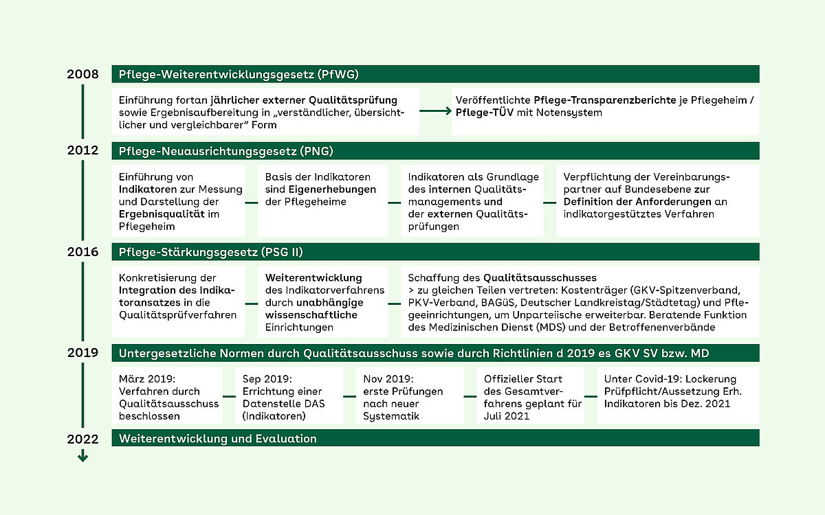 Die meisten Heime erzielten eine „Eins“. Auf der Suche nach einem Heim half dieses Qualitätssicherungssystem deshalb kaum weiter. Mit dem Pflege-Neuausrichtungsgesetz von 2012 besserte der Gesetzgeber nach und führte Indikatoren zur Messung und Darstellung der Ergebnisqualität ein. Sie dienen dem internen Qualitätsmanagement und sind Grundlage der externen Prüfungen. Dieser Ansatz wurde mit dem Pflegestärkungsgesetz II 2016 konkretisiert und weiterentwickelt. Zudem stellte der Gesetzgeber die Weichen zur Gründung eines Qualitätsausschusses aus Kostenträgern und Leistungserbringern, beratend flankiert durch Betroffenenverbände und Medizinischen Dienst.