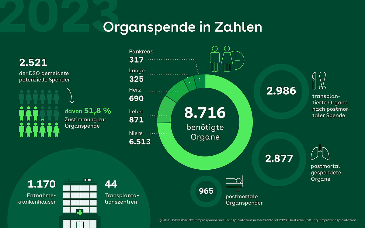 In Deutschland werden aktuell über 8.700 lebensrettende Spenderorgane benötigt. Doch haben laut der Deutschen Stiftung Organtransplantation im vergangenen Jahr insgesamt 965 Menschen nach ihrem Tod durchschnittlich drei Organe gespendet. Die Lücke zwischen gespendeten und benötigten Organen bleibt daher groß.